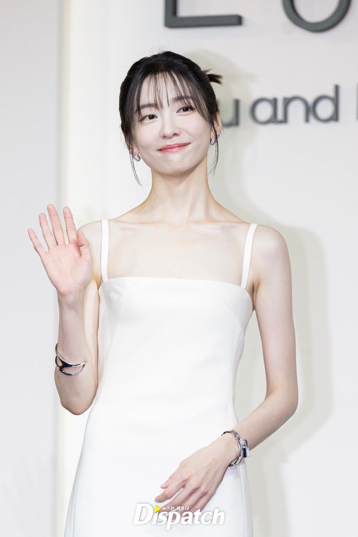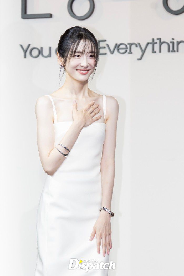 박지현은 화이트 슬리브리스 원피스로 청순한 스타일링을 연출했다.