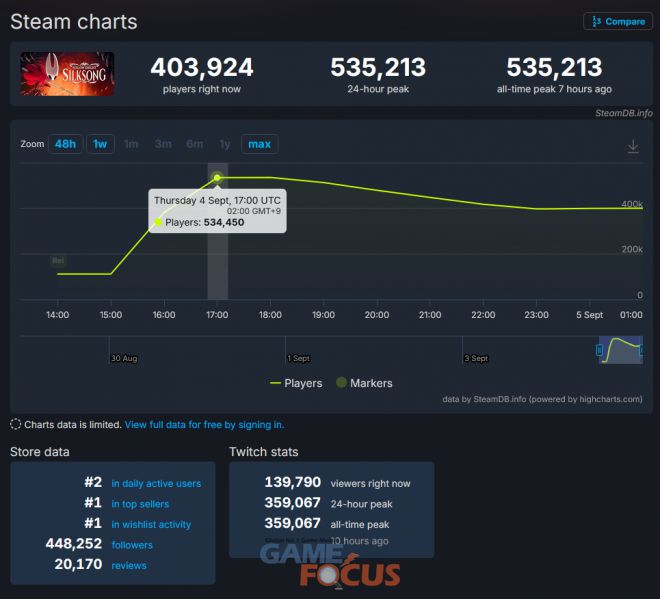 '엘든 링'이 나오고 '델타룬'의 새 챕터가 등장하는 동안에도 소식이 없었던 '할로우 나이트: 실크송'이 마침내 9월 4일 출시됐다. 2019년 첫 공개 이후 무려 6년이라는 시간 동안 기다린 게이머들의 애타는 마음을 증명하듯, '할로우 나이트: 실크송'은 '스팀'에서만 동시 접속자 53만 명을 기록하면서 화제의 중심에 섰다.