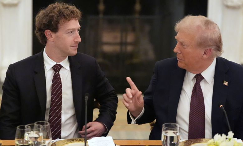 도널드 트럼프 미국 대통령과 마크 저커버그 메타 최고경영자(CEO)가 4일(현지시간) 미국 백악관에서 만찬 도중 대화하고 있다. AP연합 |