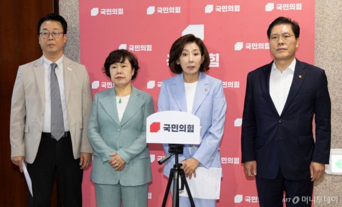 나경원·조배숙·송석준·곽규택 의원은 5일 서울 여의도 국회에서 기자회견을 열고 이같이 밝혔다. 나 의원은 통상 비공개로 진행되는 법사위 소위에서 검찰개혁 4법 입법 공청회를 공개로 진행한 데 대해 "청문회를 빙자해 이재명 대통령 재판을 뒤집겠다는 시도"라며 "이럴 거면 검찰도 법원도 폐지하고 민주당 국회만 있으면 되는 것 아니냐. 한마디로 합법을 가장한 독재, 민주적 절차를 가장한 독재"라고 했다.