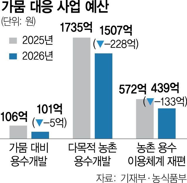 5일 서울경제신문 취재를 종합하면 정부는 내년도 예산안 가운데 가뭄 대응 예산인 ‘가뭄 대비 용수 개발’ 사업과 ‘농촌 용수 개발’ 사업 예산을 모두 올해보다 삭감했다. 가뭄 대비 용수 개발 사업 예산은 올해 106억 원에서 내년 101억 원으로 4.7% 축소됐다. 다목적 농촌 용수 개발 예산은 1735억 원에서 내년 1507억 원으로, 농촌 용수 이용 체계 재편 사업은 572억 원에서 439억 원으로 각각 13.1%와 23.2%씩 줄었다.