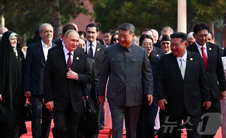 시진핑 중국 국가주석과 김정은 북한 노동당 총비서, 블라디미르 푸틴 러시아 대통령을 비롯한 주요 내빈들이 3일(현지시간) 중국 베이징시 톈안먼(천안문) 광장에서 열린 '전승절'(항일전쟁 및 반파시스트 전쟁 승리) 80주년 행사에 참석하고 있다. ⓒ AFP=뉴스1 ⓒ News1 송원영 기자 |