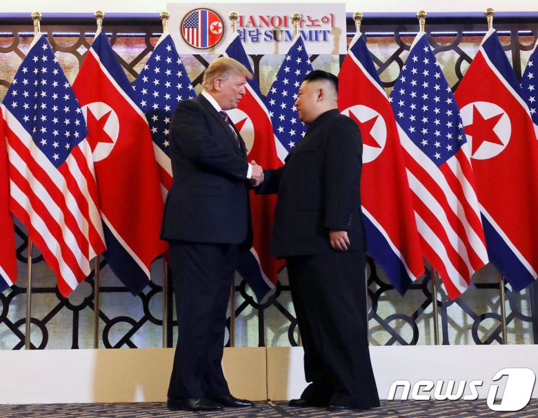 김정은 북한 국무위원장과 트럼프 미국 대통령이 27일 베트남 하노이 메트로폴 호텔에서 단독회담에 앞서 악수하고 있다. 2019.2.27/뉴스1 ⓒ 로이터=뉴스1 |