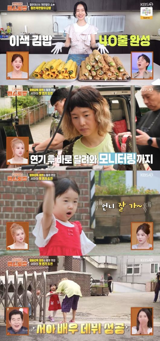 다음 날, 새벽에 일어난 이정현은 스태프를 위한 도시락을 준비하기도 했다. 초간단 김밥으로 40줄을 완성한 그는 딸 서아의 등장에 이정현은 “이따가 서아도 출연해야 한다. 잘할 수 있냐”라고 물었다. 없는 제작비에 서아에게도 출연을 부탁했다는 것.