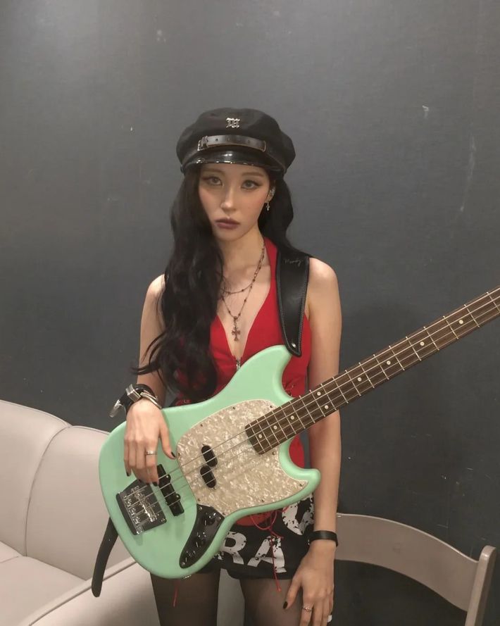 특히 베이스 기타를 들고 카메라 앞에 선 모습에서는 아티스트다운 아우라가 돋보였고, 무대 뒤 포즈에서는 독보적인 분위기로 팬들의 시선을 사로잡았다.