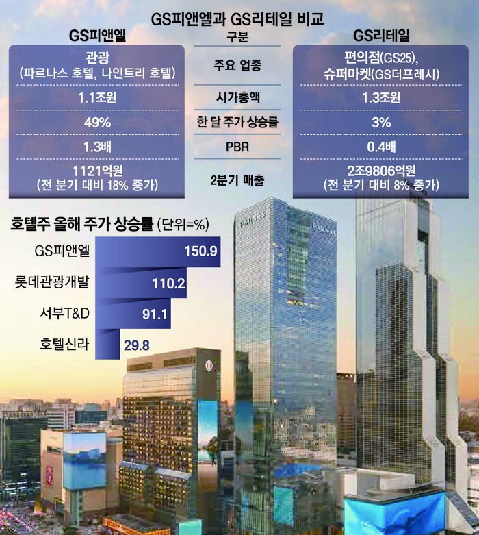 관광 대 내수업종의 명확한 온도차가 두기업 주가에 직접적인 영향을 미치는 모습이다. 실제 GS피앤엘은 최근 시총 1조1000억원을 돌파하며 시총 1조3800억원대인 GS리테일을 추격하고 있다.