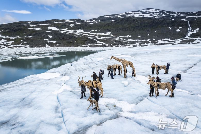 (서울=뉴스1) 황덕현 기후환경전문기자 = 하얀 빙하 위를 거대한 동물들이 천천히 걸어간다. 얼룩무늬 사슴, 목을 길게 뻗은 기린, 뿔이 길게 솟은 영양까지. 평소 살던 지역을 벗어나 극지방을 향하는 모습은 마치 추위와 굶주림을 피해 달아나는 피난 행렬 같다. 머지않아 닥칠 기후붕괴에 따른 대탈출을 예견하는 듯하다.