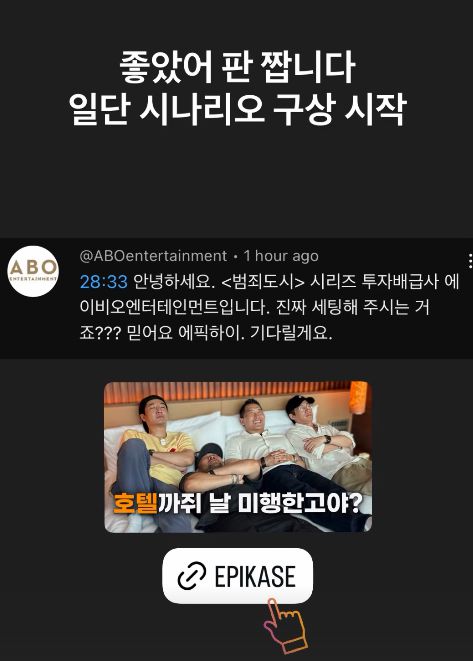 영상 공개 후 농담에 그쳤던 대화는 현실로 번졌다. 실제 '범죄도시' 투자이자 배급사인 에이비오엔터테인먼트가 공식 계정으로 "진짜 세팅해주시는 거죠? 믿어요. 에픽하이 기다릴게요"라며 댓글을 남겼다. 타블로 역시 해당 댓글을 스토리에 언급하며 "좋았어, 판 짭니다. 시나리오 구성 시작"이라고 재치 있게 응답했다.