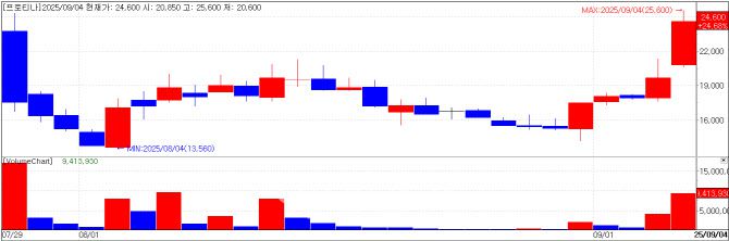 이날 KG제로인 MP닥터(옛 마켓포인트)에 따르면 프로티나는 전일 대비 24.68%(4870원) 오른 2만 4600원에 마감했다. 장중 2만 5600원까지 치솟았다가 소폭 조정된 값에 장을 마쳤다.