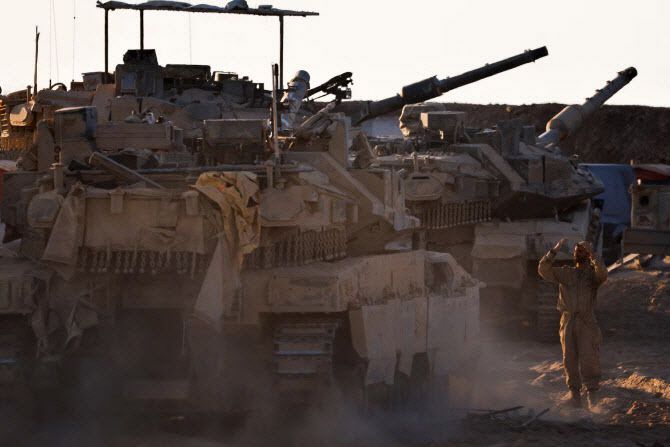 4일(현지시간) 이스라엘에서 한 이스라엘 군인이 가자지구 국경 근처에서 탱크를 지휘하고 있다. (사진=로이터) |