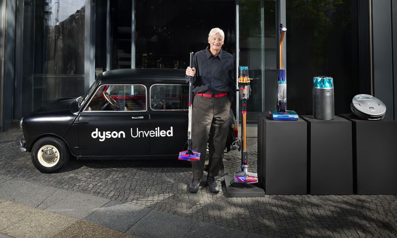 다이슨 창립자 제임스 다이슨이 4일(현지시간) 독일 베를린에서 열린 독점 출시 행사 ‘다이슨 언베일드’에서 신제품들과 포즈를 취하고 있다. 다이슨 제공