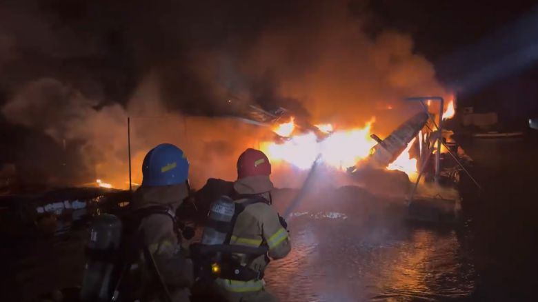 여수해경은 오전 4시 10분쯤 큰 불길을 잡았지만, 이 불로 거주시설, 사료 냉동창고, 기타 창고 각각 1동씩과 양식장 일부가 불에 타는 피해가 났습니다.