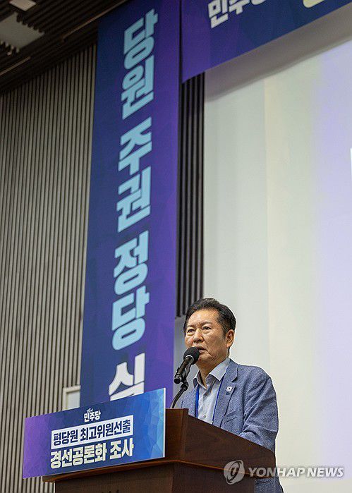 (서울=연합뉴스) 더불어민주당 정청래 대표가 6일 경기도 고양시 킨텍스에서 열린 평당원 최고위원 선출 경선공론화 조사 행사에 참석해 축사하고 있다. 2025.9.6 [더불어민주당 제공. 재판매 및 DB 금지]