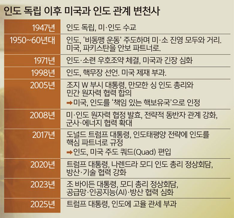 지난달 27일(현지시간) 미국은 몇 달을 끌어온 인도와의 무역 협상 끝에 대부분의 인도산 제품에 50%의 관세를 발효했다. 이는 트럼프 행정부가 중국에 100%가 넘는 고율관세를 부과하다가 유예한 뒤 전 세계에 부과하는 관세율 중 가장 높은 수준이다. 트럼프 대통령은 “인도와의 거래는 지나치게 일방적이며, 더 용납할 수 없다”고 주장했다. 트럼프 대통령이 가을 인도에서 열리는 쿼드(Quad·미국, 일본, 인도, 호주 4자협의체) 정상회의에 불참한다는 보도도 나왔다.