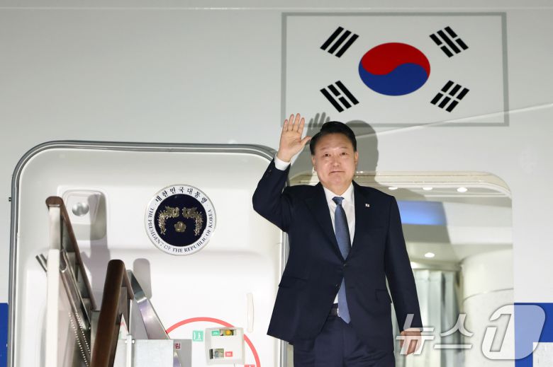 윤석열 대통령이 21일 아시아태평양경제협력체(APEC) 및 주요 20개국(G20) 정상회의 일정을 마치고 성남 서울공항에 도착해 전용기에서 인사하고 있다. (대통령실 제공) 2024.11.21/뉴스1 ⓒ News1 송원영 기자