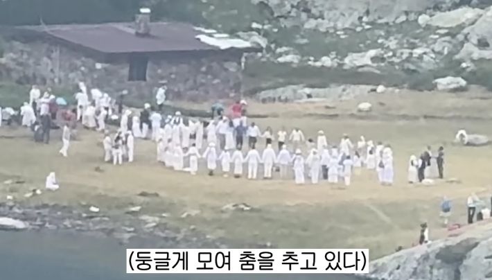 계속 걷던 노홍철은 흰옷을 입은 무리와 가까워졌다. 그는 "특이하게 이분들이 저처럼 등산복 차림으로 왔다가 여기서 종교의식을 할 때는 흰옷으로 갈아입는다"고 전했다.