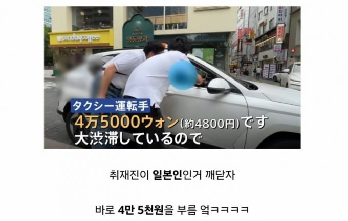 해당 게시글의 원본 작성자는 일본 현지 뉴스 방송 화면을 공유하며 "명동에서 홍대까지 보통 1만2000원 정도 나오는 거리인데 취재진이 일본인임을 깨달은 택시 기사가 4만5000원을 불렀다"고 전했다.