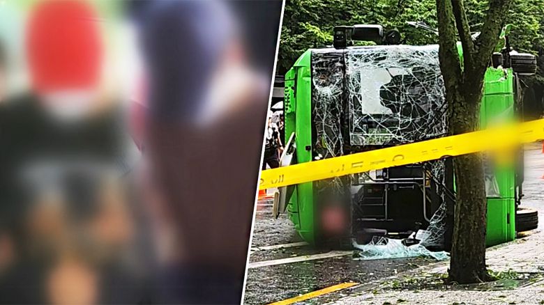 버스 한 대가 도로 한가운데 쓰러져 있습니다.