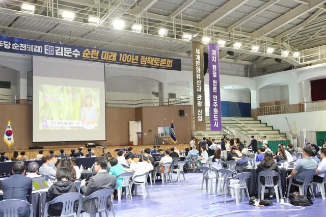 더불어민주당 김문수 의원(순천갑)이 6일 주최한 '순천 미래 100년 정책토론회'가 300여 명의 시민과 당원이 참석한 가운데 순천대학교 체육관에서 열렸다.