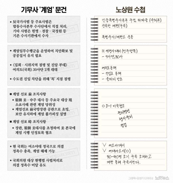 이처럼 수첩과 문건은 일치하는 내용이 적지 않은데, 특검은 노 전 사령관이 기무사 문건을 참고해 수첩 내용을 작성한 것은 아닌지 의심 중이다. 노 전 사령관은 12·3 계엄 선포문이나 포고령 등을 직접 작성했다는 의혹을 받고 있는데, 기무사 계엄 문건에도 선포문과 포고령 양식이 있다.