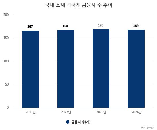 금융산업 경영 환경이 갈수록 위축되면서 외국계 금융사 수는 사실상 정체 상태를 이어가고 있다. 지난해 말 기준 은행을 비롯해 금융투자, 보험, 여신전문, 저축은행 등 외국계 금융회사 수는 169개로 지난 2023년보다 1개 줄었다. 금융투자사가 67개로 가장 많았고 그 뒤로 은행(51개), 보험(26개), 여신전문(17개), 저축은행(8개) 등 순이었다.