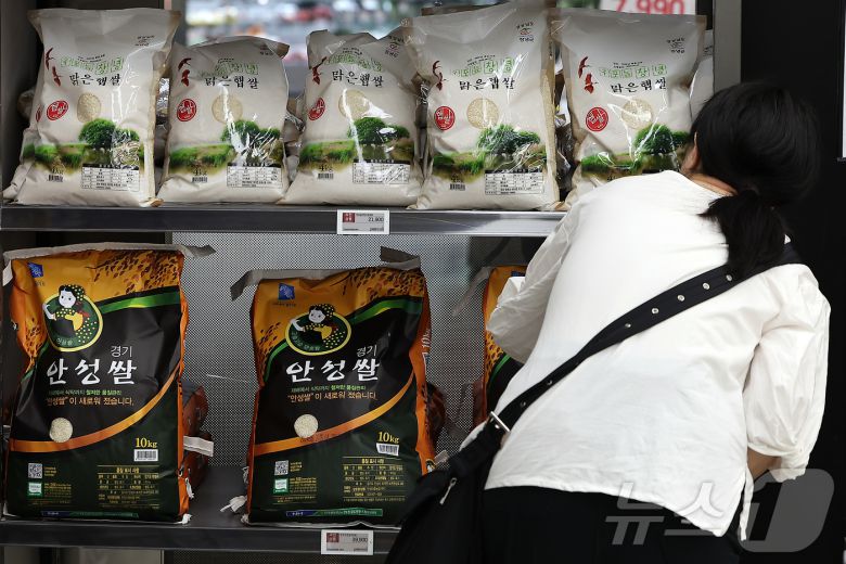쌀 소매가격이 20㎏당 평균 6만원을 돌파했다. 서울 시내 한 대형마트를 찾은 시민이 쌀을 고르는 모습. 2025.9.3/뉴스1 ⓒ News1 김진환 기자