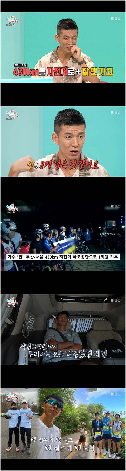 션은 “자전거로 부산에서 서울까지 430km를 잠 안 자고 종단했다”라고 말했다. 션은 “당연히 졸리다. 12시간 정도 지나니까 언덕을 오르니까, 졸리더라. 그래서 에너지 드링크 2개를 먹고 올랐다”라며 “그런데 그날 아이들 데리고 양양에 가기로 했다. 그래서 집에 와서 잠을 좀 자고 운전을 해서 양양을 데리고 갔다”라고 말해 육아에도 소홀하지 않는 삶을 보였다.