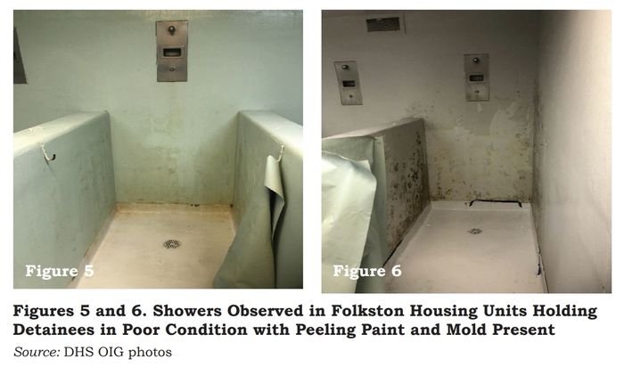감사실은 “찢어진 매트리스, 누수, 고인 물, 곰팡이, 낡은 샤워 시설, 환기 시스템에 곰팡이와 잔해, 만연한 벌레, 뜨거운 물이 부족한 샤워, 작동하지 않는 변기, 주방 냉동고의 고장 난 온도계, 따뜻한 식사의 부재”를 지적했다.