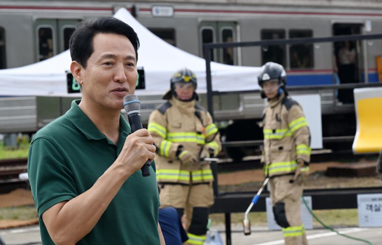 오세훈 서울시장이 4일 오후 경기 고양시 지축차량기지에서 열린 5호선 열차 방화관련 화재안정성 및 비상대응 검증을 위한 전동차 화재안전 시연회에서 인사말을 하고 있다. /뉴스1 |