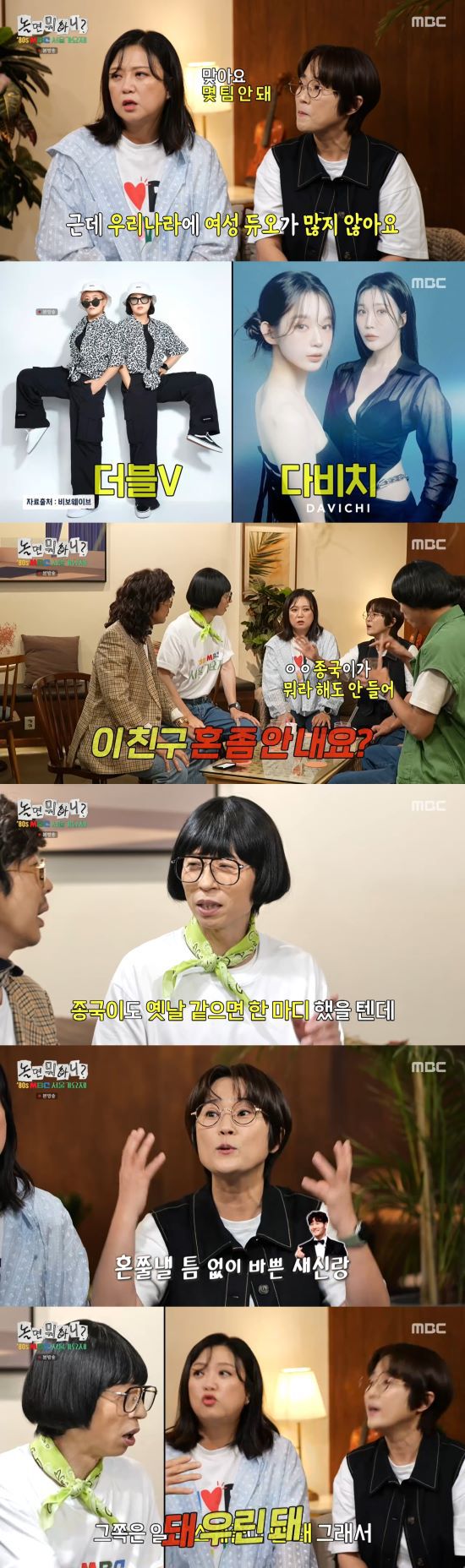 이날 송은이가 다비치와 더블V가 같이 언급된 데 당황한 마음을 표하자, 주우재는 "다비치는 80년대 갓 태어나셨겠지만, 이 두 분은 30대셨지 않느냐"라고 말해 하하에게 "세수 좀 하고 왔으면 좋겠다"라고 지적받아 웃음을 유발했다.