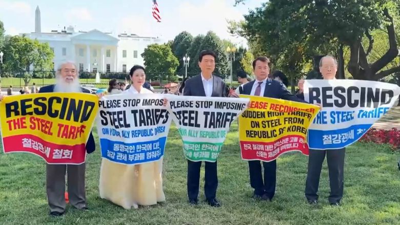 미국 워싱턴 D.C. 백악관 앞, 이강덕 포항시장이 '동맹국인 한국에 대한 철강 관세 부과를 멈춰달라'는 피켓을 들고 서 있습니다.