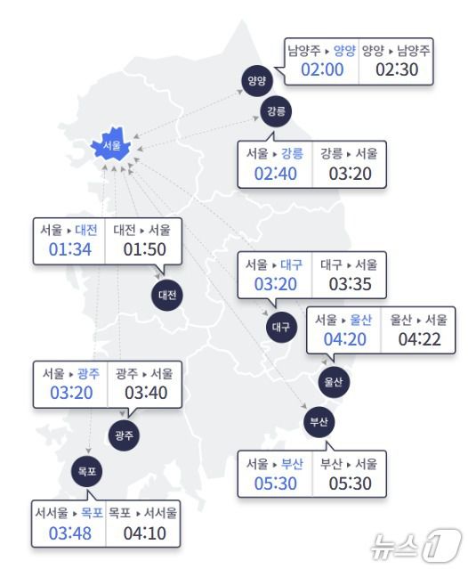 같은 시간 서울에서 지방 주요 도시까지는 △부산 5시간 30분 △울산 4시간 20분 △강릉 2시간 40분 △양양 2시간(남양주 출발) △대전 1시간 34분 △광주 3시간 20분 △목포 3시간 48분(서서울 출발) △대구 3시간 20분이다.