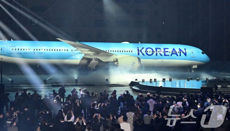 11일 서울 강서구 대한항공 격납고에서 열린 '라이징 나이트(Rising Night)' 행사에서 새 기업이미지(CI)를 입힌 보잉 787-10 항공기가 공개되고 있다. 2025.3.11/뉴스1 ⓒ News1 공항사진기자단 |