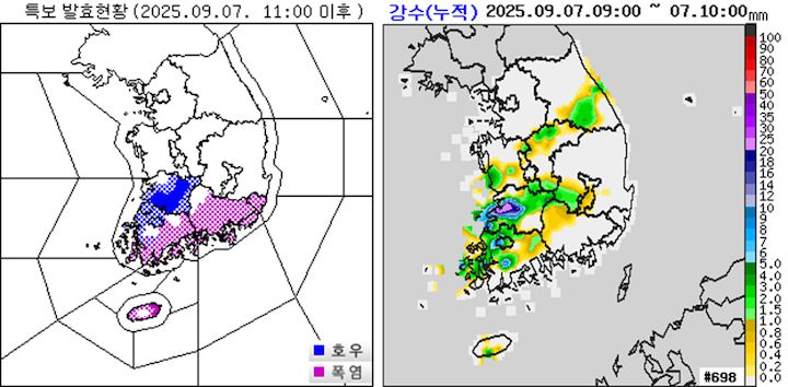 기상청은 7일 오전 10시 속보를 통해 전북과 충남을 중심으로 시간당 40mm 안팎의 강한 비가 내리고 있으며, 호우와 폭염 특보가 동시에 발효됐다고 밝혔다.