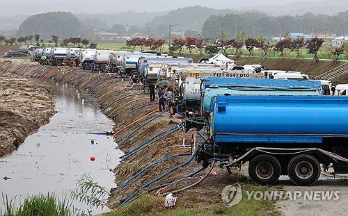 (강릉=연합뉴스) 유형재 기자 = 최악의 가뭄이 이어지는 7일 강원 강릉의 한 하천에서 살수차들이 비가 내리는 가운데 운반급수를 위해 줄지어 취수하고 있다. 2025.9.7