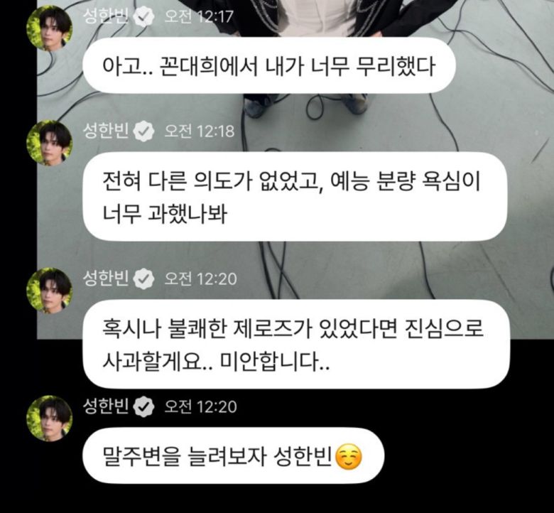 그는 "아고.. 꼰대희에서 내가 너무 무리했다. 전혀 다른 의도가 없었고 예능 분량 욕심이 너무 과했나 봐"라며 "혹시나 불쾌한 제로즈(팬덤명)가 있었다면 진심으로 사과할게요. 미안합니다. 말주변을 늘려 보자 성한빈"이라고 고개 숙였다.