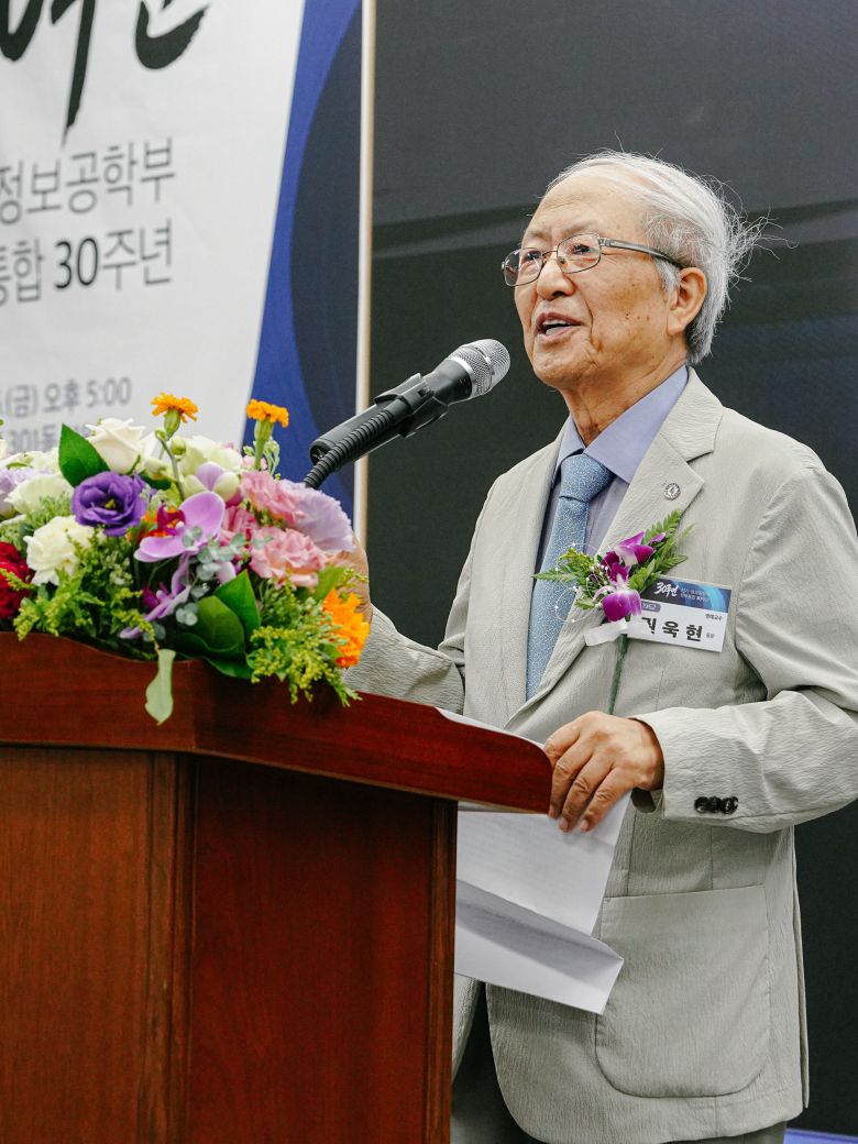 지난 5일 오후 서울대 제1공학관에서 권욱현 서울대 명예교수가 서울대 전기·정보공학부 학부 통합 30주년 기념행사 축사를 하고 있다./서울대 전기·정보공학부 |