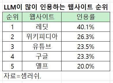정보분석업체 셈러쉬가 지난 6월 챗GPT, 퍼플렉시티, 구글 인공지능(AI모드·AI오버뷰) 등을 조사한 결과 LLM이 가장 많이 인용하는 웹사이트는 레딧이었다.