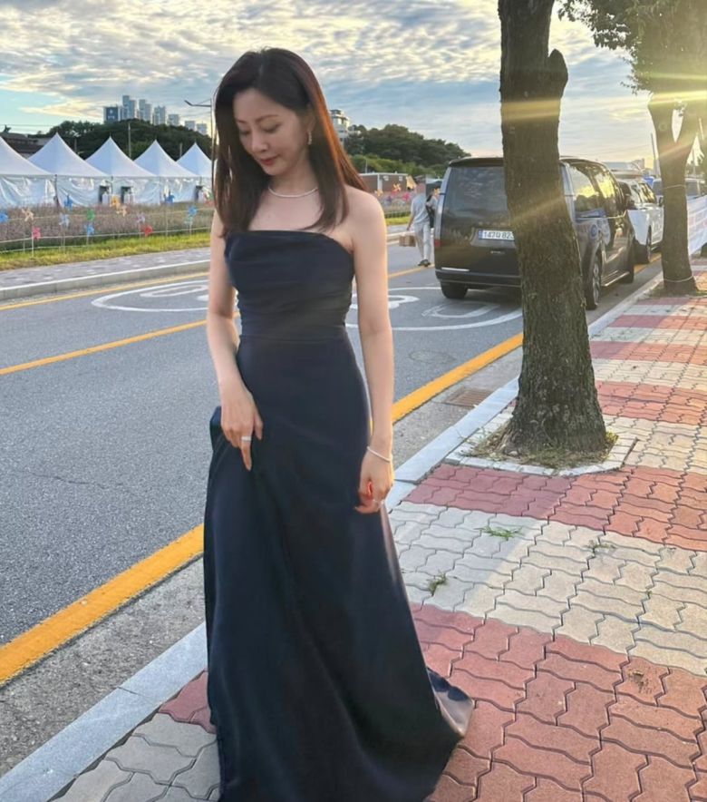오나라가 야외에서 네이비 드레스로 우아함을 드러냈다.