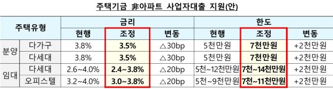 비(非)아파트 주택에 대한 주택도시기금 지원을 확대한다. 이에 따라 분양 및 임대 다가구주택·오피스텔에 대해 건설자금 사업자 대출금리를 20~30bp 인하하고 대출한도를 2000만원 상향한다. 이 조치는 단기적 공급위축에 대응하기 위한 것으로 2027년말까지 한시적용된다.