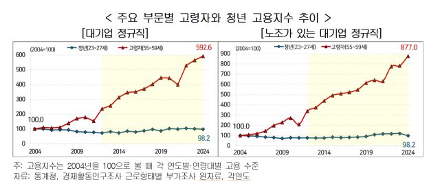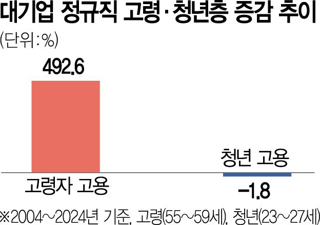 대기업 정규직들의 근속 연수가 늘면서 청년 채용은 줄었다. 지난 20년간 대기업 정규직 중 고령자(55~59세) 고용은 492.6%나 증가했다. 반면 청년(23~27세) 고용은 1.8% 감소했다. 이에 따라 대기업 정규직 내 고령자 비중은 20년간 2.9%에서 9.3%로 6.4%포인트 증가했으나 청년 비중은 오히려 6.4%포인트 감소(13.7%→7.3%)했다.