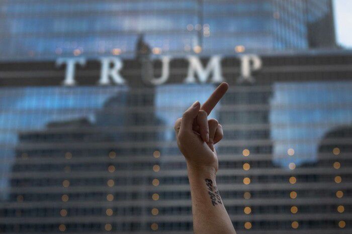 6일(현지시각) 미국 일리노이주 시카고에서 열린 이민 정책 반대 시위 중 트럼프 타워 앞을 지나며 가운데 손가락을 들어보이고 있다. AFP 연합뉴스