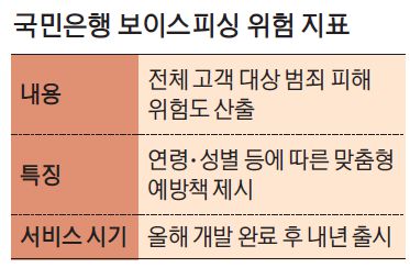KB국민은행이 3400만명 전 고객을 대상으로 보이스피싱 위험 지표를 만든다. 연내 통계·분석 전문 인력과 조직을 대폭 강화해 내년부터 고객별로 보이스피싱 피해 위험도를 측정해 맞춤형 피해 예방에 나선다.