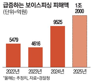 한편 보이스피싱 피해는 올 들어 눈덩이처럼 불어나고 있다. 경찰에 따르면 지난해 피해액은 9525억원에 달했는데, 이 속도로 범행이 늘어난다고 보면 올해 피해 규모는 1조2000억원으로 처음 1조원을 돌파할 것으로 추산된다. 올해 1~7월 보이스피싱·스미싱 범죄 피해액은 7992억원으로 지난해 같은 기간에 비해 95% 급증했다.