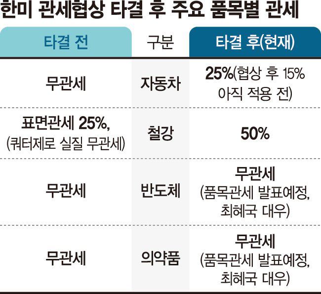 7일 기준 한국의 대미 수출품에는 15% 상호관세가 적용되고 있다. 당초 협상이 결렬됐다면 트럼프 행정부가 공언한 25% 관세가 실제 부과될 예정이어서 수출기업의 피해가 불가피했다. 정부는 '마스가(MASGA·미국 조선업을 다시 위대하게)' 구상을 앞세워 대규모 대미 투자 패키지를 제시하며 관세를 15%로 낮추는 데 성공, 피해를 줄였다는 평가다. 특히 민감하게 거론됐던 농축산물 시장은 "추가 개방이 없다"는 입장을 끝까지 지켜낸 점도 성과로 꼽힌다.
