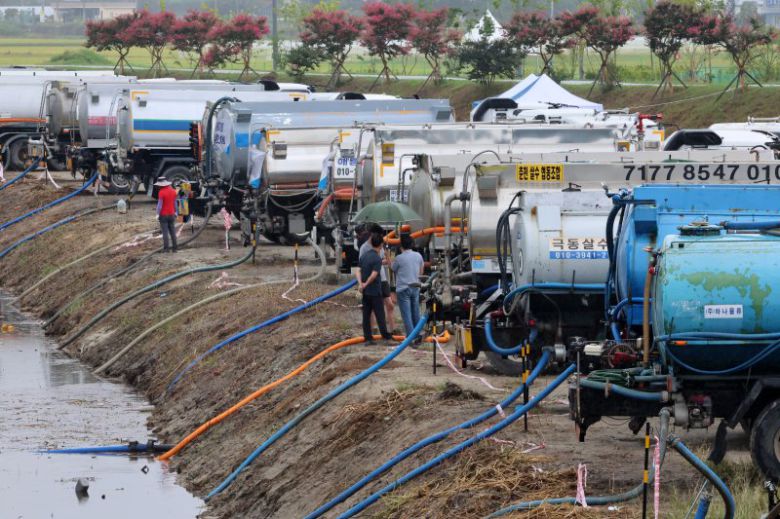 취수 행렬최악의 가뭄이 이어지는 7일 강원 강릉의 한 하천에서 살수차들이 비가 내리는 가운데 운반급수를 위해 줄지어 취수하고 있다. 연합뉴스