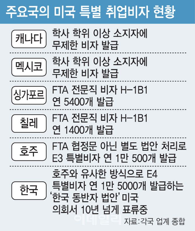 호주와 유사한 방식으로 E4 특별비자 연 1만5000개를 발급하는 ‘한국 동반자 법안’이 2013년부터 미국 의회에 계류돼 있지만, 무관심 속에 10년 넘게 표류했다. 또다른 재계 고위관계자는 “E4 비자만 있어도 첨단 제조 공장을 가동하는데 큰 도움이 될 것”이라고 했다. 강훈식 비서실장은 “향후 유사 사례 재발 방지를 위해 대미 출장자의 체류 사유와 비자 체계를 점검·개선할 방안을 추진할 것”이라고 했다.