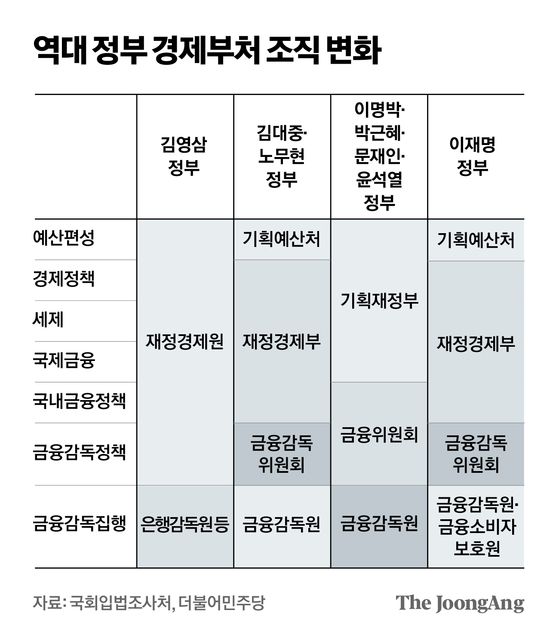 이번 정부의 경제부처 조직 개편안의 골자는 비대한 기재부 조직을 쪼개 정책 효율성을 높이겠다는 취지다. 이재명 대통령과 여당 의원들은 그동안 기재부의 권한이 과도하다는 지적을 이어왔다. 이 대통령도 후보시절 “기재부가 경제 기획을 하면서 한편으로 재정을 컨트롤해 ‘왕 노릇’을 하고 있다는 지적들이 상당하다“고 말했다. 이날 윤호중 행정안전부 장관도 “경제정책 수립ㆍ조정과 세입, 세출 등 기능이 과도하게 집중된 기재부를 분리 개편한다”고 설명했다.