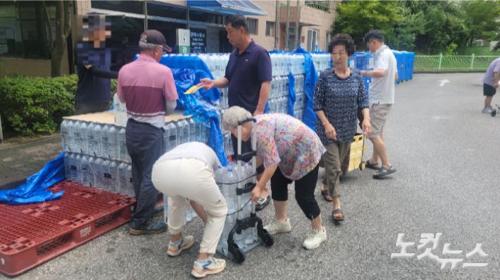 강릉 교동의 한 아파트에서 주민들에게 생수를 배부하고 있는 모습. 전영래 기자
