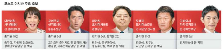 최근 언론사 여론조사에서 앞서 있는 인물은 '여자 아베'로 불리는 다카이치 사나에 전 경제안보상이다. 극우 성향인 그는 태평양전쟁 A급 전범이 합사된 야스쿠니 신사를 단골로 참배하는 것으로 유명하다. 2021년 선거 출마 때에는 아베 신조 전 총리의 전폭적인 지지를 받았고, 지난해에는 1차 선거에서 이시바 총리를 제치고 1위를 차지했지만 2차 선거에서 뒤진 바 있다. 2위는 고이즈미 신지로 농림수산상이다. 1981년생으로 40대인 그는 고이즈미 준이치로 전 총리의 아들이다.